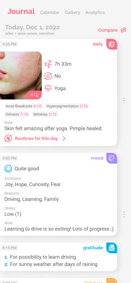 Track how your skin changes over time - take & compare photos from different days, log your mood, period, sleep, exercise patterns and see if there are any relations between them.