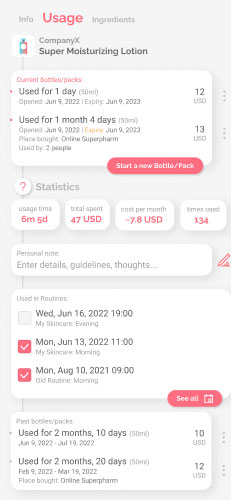 Track how long a product lasts and make sure you’re not applying the expired ones, learn about ingredients and their purpose.